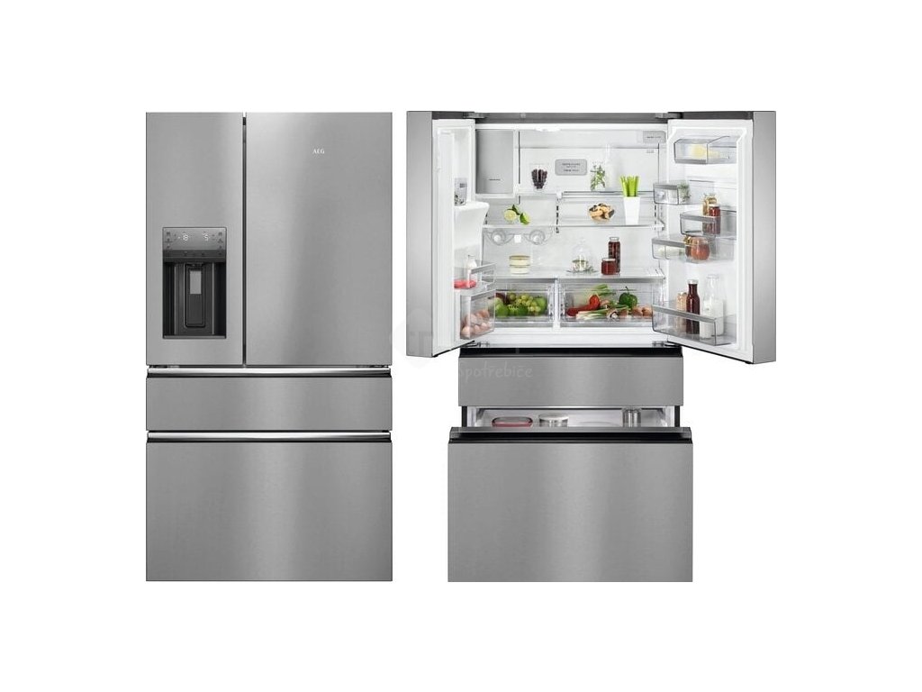 Vícedveřová chladnička NF; AEG 9000 MultiSwitch RMB954E9VX; Typ: 4 dvéřová; Šířka (cm): 91,3; Technológia: No Frost; En.třída: E; Ovládání: Elektronické, dotykové na dveřích; Čistý objem chladničky/mrazničky (l): 378 / 164; Hlučnost (dB): 40; Ventilátor: Multiflow; Nízkoteplotní zásuvka: Ano; Speciální funkce: CustomFlex, Zóna MultiSwitch+; Barva: Nerez s ochranou proti otiskům; Rozměry VxŠxH (mm): 1782x913x746