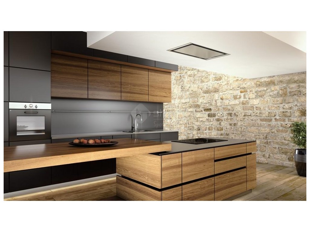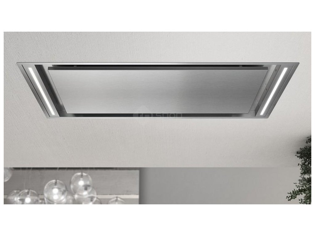 Luxusní stropní digestoř v elegantním provedení je vybavená výkonným motorem s nízkou spotřebou elektrické energie.