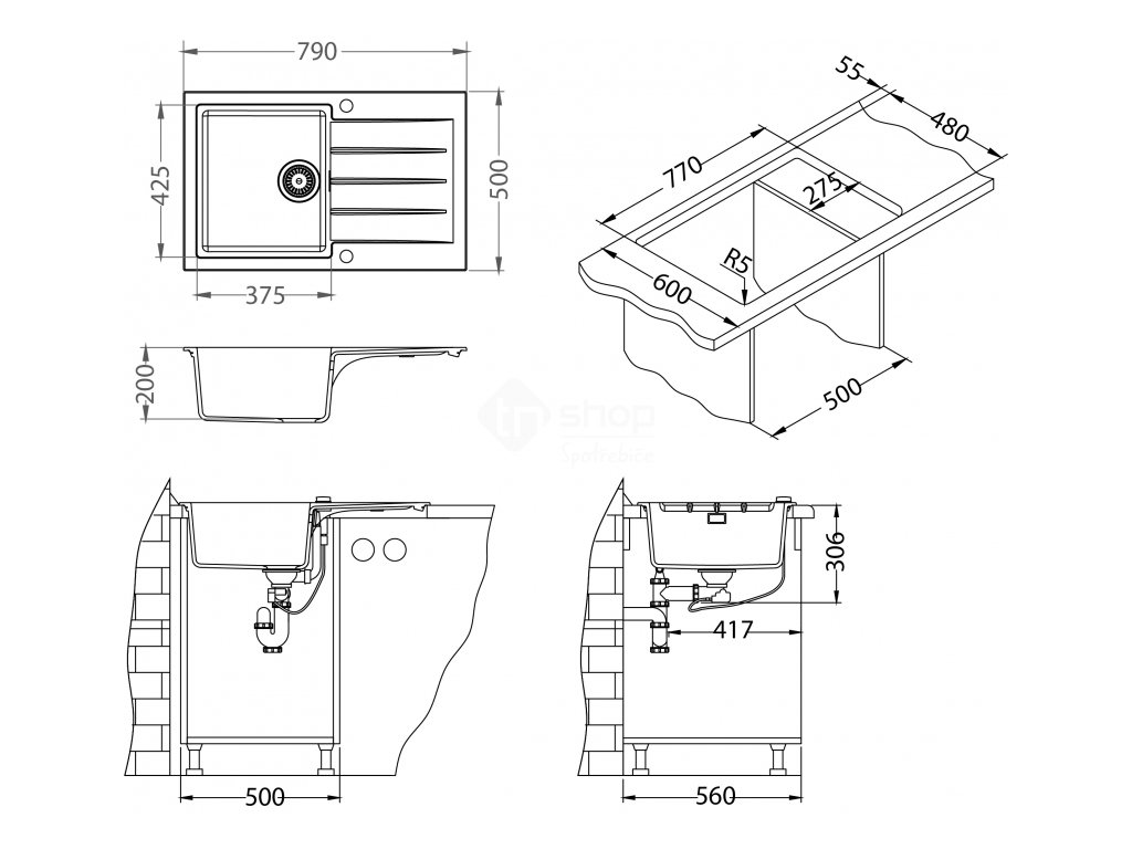 Vestavěný dřez, univerzál. Provedení : granitový dřez s odkapem Vnější rozměr: 790 x 500 mm Rozměr vaničky: 375 x 425 x 200 mm