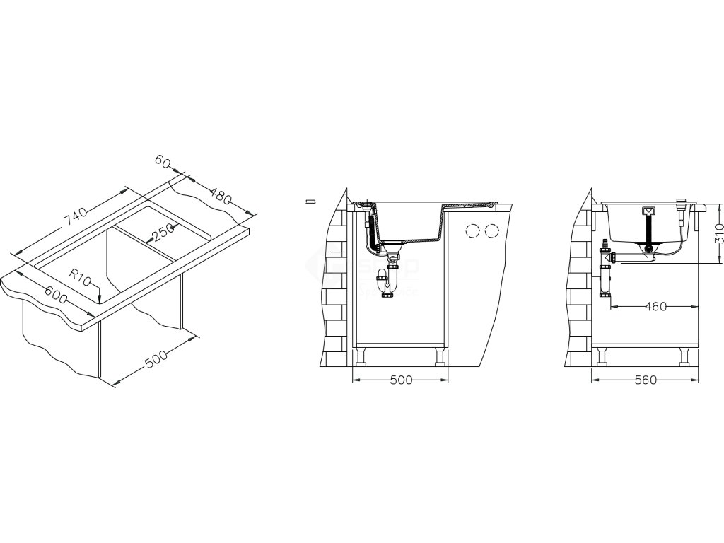 Vestavěný nebo dřez se spodní montáží, univerzál. Provedení : granitový dřez Vnější rozměr: 760x500 mm Rozměr vaničky: 347x420x200 mm