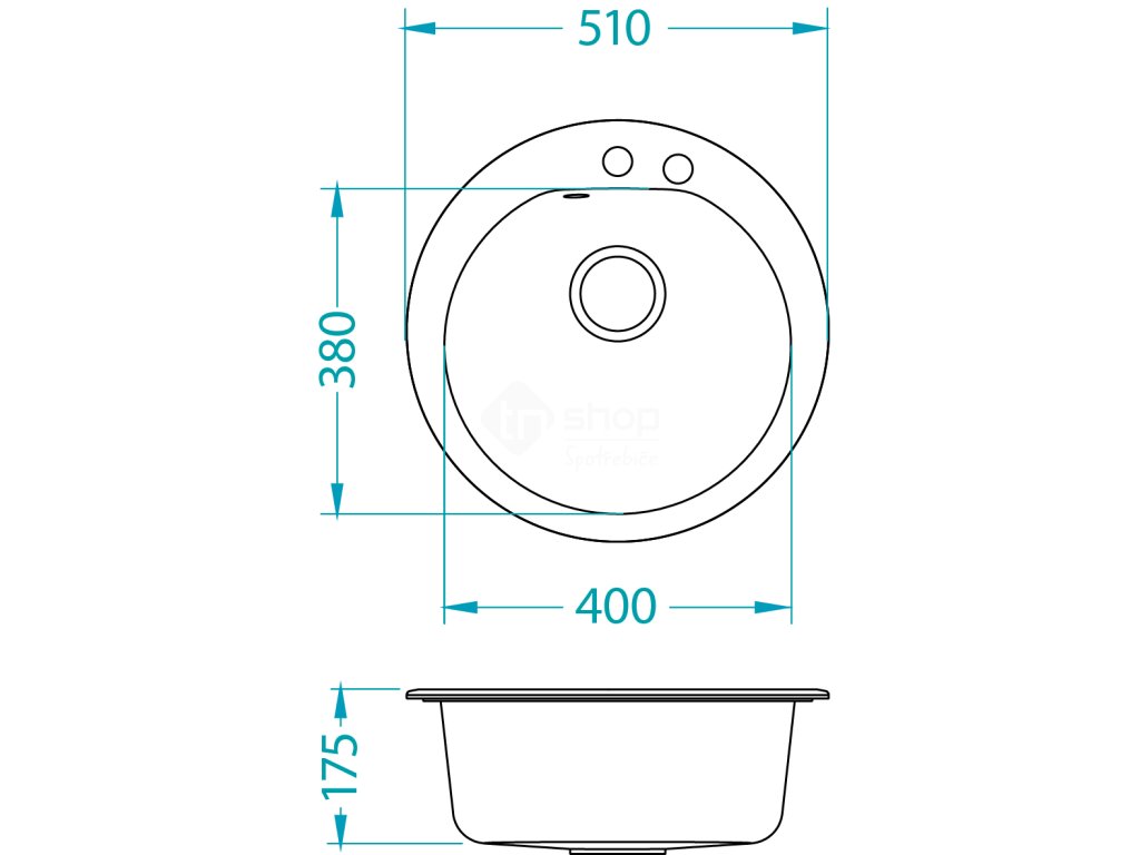 Vestavěný dřez, univerzál. Provedení : granitový dřez s odkapem Vnější rozměr: průměr 510 mm Rozměr vaničky: průměr 400 x 175 mm