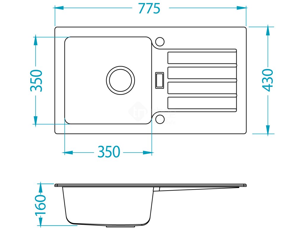 Vestavěný dřez, univerzál. Provedení : granitový dřez s odkapem Vnější rozměr: 775 x 430 mm Rozměr vaničky: 350x350x160 mm
