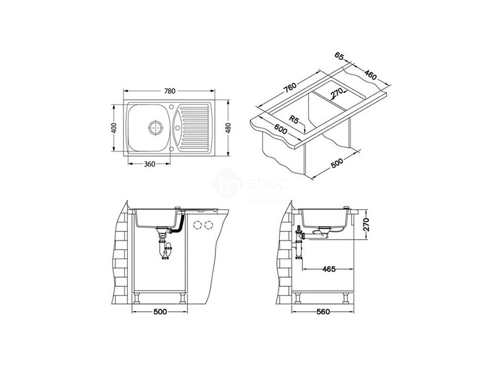Vestavěný dřez, univerzál. Provedení : granitový dřez s odkapem Vnější rozměr: 780 x 480 mm Rozměr vaničky: 359 x 399 x 160 mm