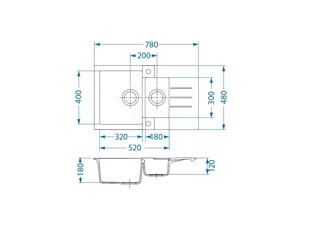 Vestavěný dřez, univerzál. Provedení : granitový dřez s odkapem Vnější rozměr: 780 x 480 mm Rozměr vaničky: 320 x 400 x 180 mm 180 x 300 x 120 mm