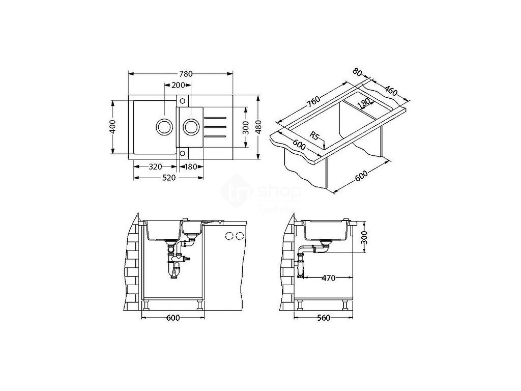 Vestavěný dřez, univerzál. Provedení : granitový dřez s odkapem Vnější rozměr: 780 x 480 mm Rozměr vaničky: 320 x 400 x 180 mm 180 x 300 x 120 mm