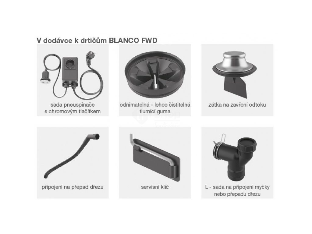 Blanco drtič FWD Medium • prémiový model pro pravidelnou likvidaci velkého množství odpadu z potravin ve velkých domácnostech • optimální příslušenství pro dřezy BLANCO • vysoce kvalitní a výkonný AC indukční motor • snadná instalace díky tříšroubovému instalačnímu systému • drticí komponenty z nerezové oceli • 3 fáze drcení pro dosažení velmi jemných výsledků • objem drticí komory 1200 ml