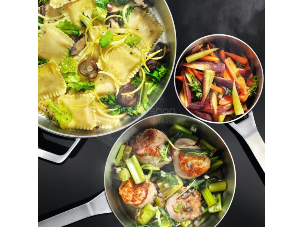 Indukční varná deska 600 Bridge vám umožňuje kombinovat dvě různé varné zóny a vytvořit tak jednu velkou varnou plochu. Nastavení teploty a času jsou automaticky sladěna a varnou plochu využijete na maximum s grily plancha nebo restovacími pánvemi.
