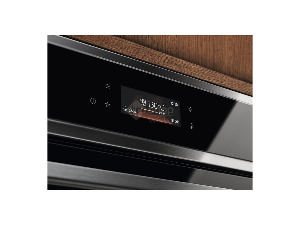 - Možnost elektronického nastavení trouby: Function lock (in running mode), tóny kláves, alarmů a chyb, aktivace/deaktivace (kromě hlavního vypínače), hlavní vypínač, denní paměť 3 dny zpětně, minutka, Oven light on/off selectable (menu direct access button), ukazatel teploty (°C), ukazatel zbytkového tepla, použití zbytkového tepla, info k servisu, vypnutí denního času při vypnuté troubě, doporučená teplota, denní čas, výběr rychlého předehřátí, jídelní sonda, automatické vypnutí jídelní sondy, jídelní sonda - indikace teploty jádra, Food sensor end action adjustable, jídelní sonda s odhadem času, 171 Variety of pre-set cooking programmes 'Assist', 3 oblíbené programy, 3 pyrolytické cykly (rychlý, normální, intenzivní), 31 Languages/Text display, akustický signál, automatické vypnutí (jen trouby), nastavení hlasitosti minutky, Prověření výsledku/Prodloužení času (Finish Assist podle zbývajících 10 % doby trvání), Dětský zámek, minutka pro čištění, Standby verze, čas vaření, čas vaření s odhadem konce, přičítání času, Odložený start, demo program s kódem, nastavení jasu disp., TFT plnobarevný dislplej s dotykovým ovládáním, elektronická regulace teploty, elektronický zámek dveří, Electronical door switch