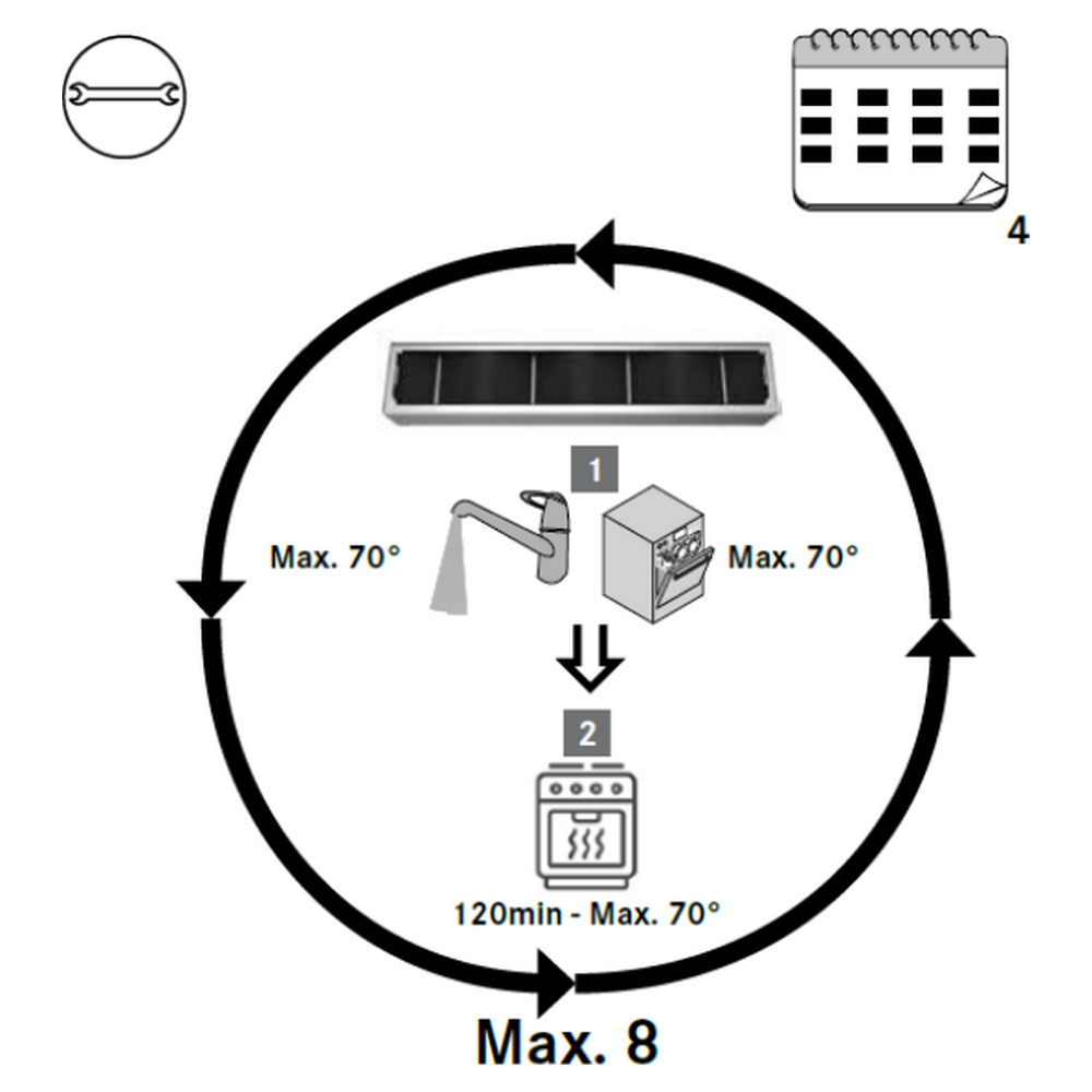 Životnost filtru je omezena na maximálně 8 regeneračních cyklů. Pro zachování optimální účinnosti se doporučuje filtr regenerovat přibližně 1× za 4 měsíce, v závislosti na intenzitě vaření.
