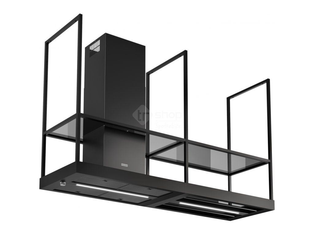Ostrůvkový odsavač par Mythos T-Shelf v industriálním designu s kouřovými skleněnými policemi.