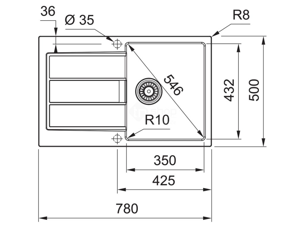 - Dřez: 350 × 432 × 200 mm