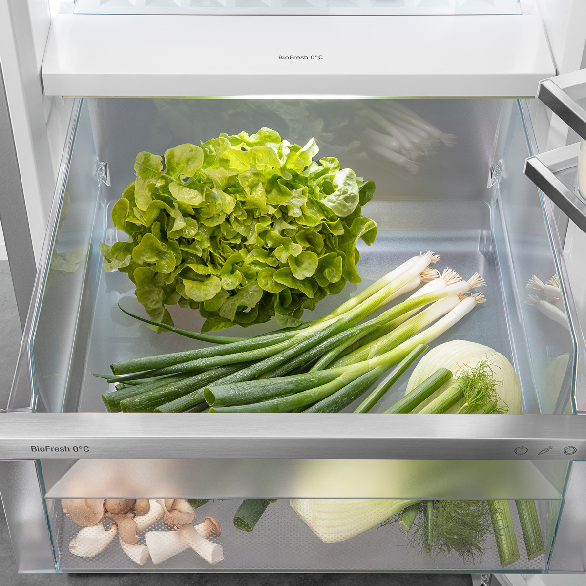 Křupavý salát nebo jahody: Nejcitlivější potraviny si zaslouží zvláštní místo, aby zůstaly déle čerstvé: Přihrádky BioFresh. V přihrádce na ovoce a zeleninu se teplota blíží 0 °C. V kombinaci s vlhkostí vzduchu, která v této přihrádce převládá, a díky jejímu těsnému uzavření je zde nebalenému ovoci a zelenině obzvláště dobře. Nemusíte nic nastavovat.
