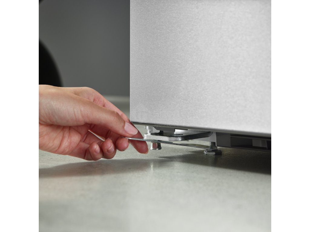 Díky dvěma nastavitelným seřizovacím nožkám lze spotřebič optimálně vyrovnat a přizpůsobit jej okolí, například nerovné podlaze. Proto si můžete být jisti, že dveře chladničky dokonale těsní a do spotřebiče nevniká teplo ani se v něm netvoří kondenzát. To také šetří energii a peníze.