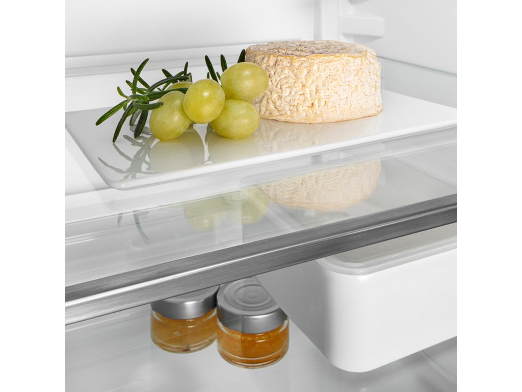 Chcete dát do chladničky velkou nádobu? Pak si jednoduše upravte výšky zasunutí skleněných desek. Díky komfortnímu nastavení výšky to lze provést rychle a přesně podle vašich potřeb – dokonce i s potravinami uloženými na deskách.