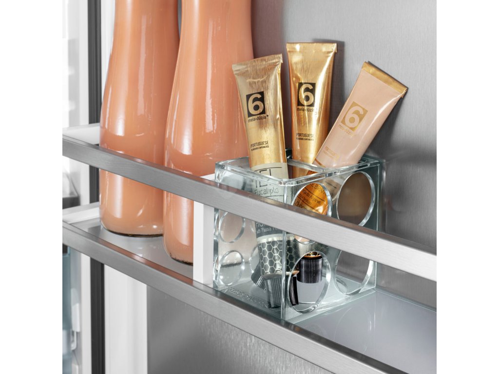 Čekáte hosty a chcete vychladit o několik nápojů víc než obvykle? K tomu účelu je k dispozici polička na láhve nad přihrádkami BioFresh: Jedním pohybem ruky jednoduše vyjmete skleněnou desku nad poličkou na láhve – a již můžete bezpečně skladovat a chladit láhve různých velikostí.