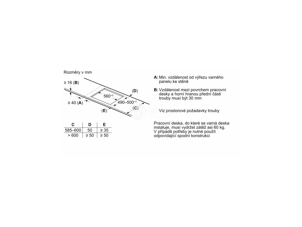Požadovaná velikost otvoru pro instalaci (v x š x h): | 51 x 560-560 x 490-500 mm |