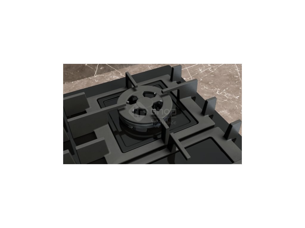 Plynová varná deska z tvrzeného skla s částečně spojenými rošti snadné čištění.