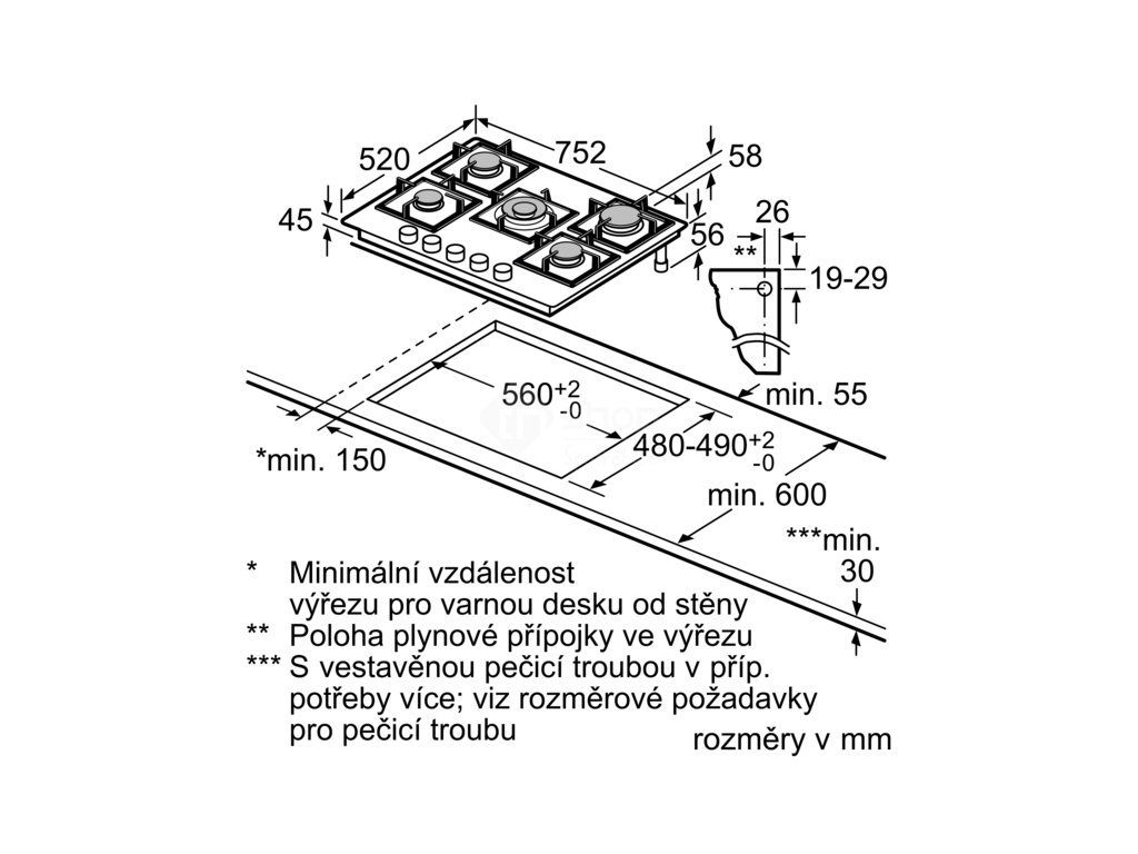 Jedna plynová varná deska se dvěma možnostmi instalace.