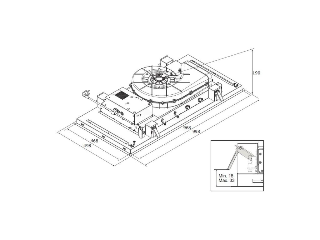Digestoř má velmi jednoduchou montáž a nízkou vestavnou část (190 mm). Díky tomu je možné digestoř instalovat i do nízkých podhledů.