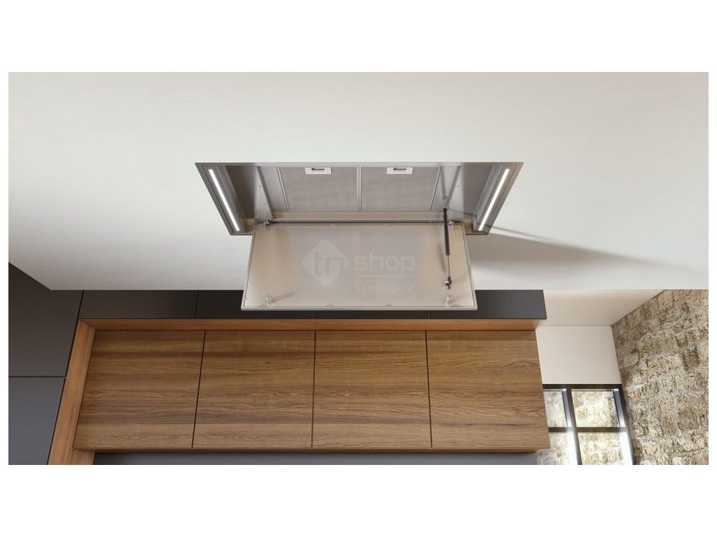 Luxusní stropní digestoř v elegantním provedení je vybavená výkonným motorem s nízkou spotřebou elektrické energie.