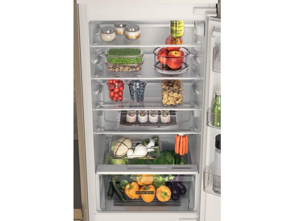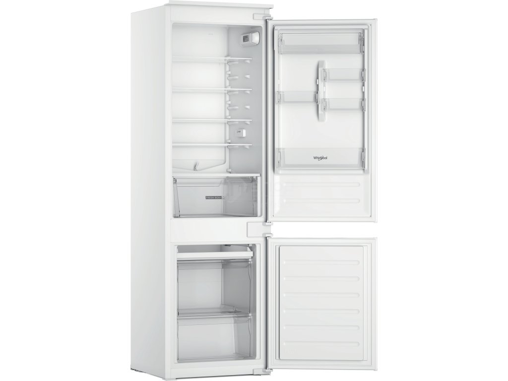 Přednosti této vestavné kombinované chladničky Whirlpool: bílá barva. Skleněné police, které poskytují pevnost i eleganci. Senzory 6. SMYSL, které automaticky snižují teplotu uvnitř spotřebiče po přidání nových potravin, čímž snižují spotřebu energie. Robustní přihrádka na lahve pro bezpečné uložení lahví.