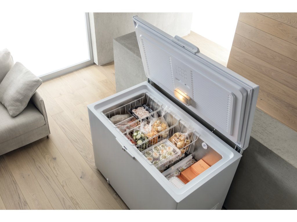 Snadnější otevírání a zavírání. Truhlicová mraznička má systém vyvažování dveří, takže se snadno otevírá a zavírá a při otevření zůstávají dvířka ve stabilní poloze.
