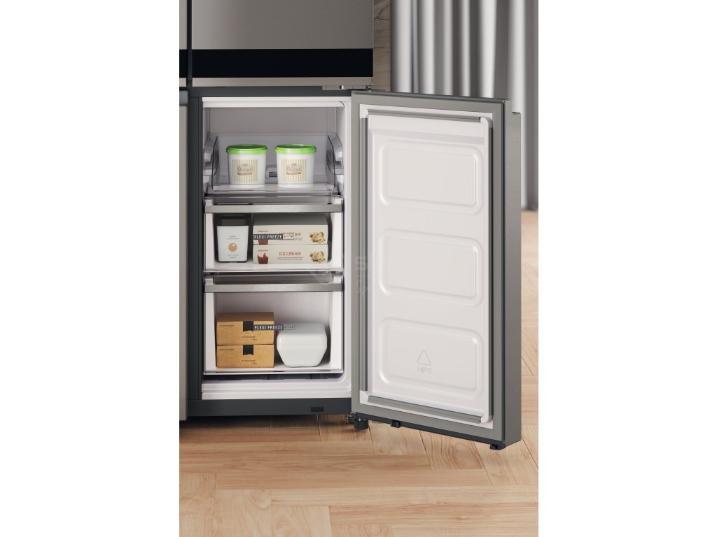 Prostorná přihrádka FlexiFreeze se přizpůsobí vašim potřebám a umožní vám zvolit správnou úroveň teploty pro to, co právě skladujete. Soft Freeze - 7 °C:vyhněte se procesu rozmrazování u zmrazených potravin, které sníte do týdne. Potraviny můžete vložit přímo z mrazničky do hrnce. Mild Freeze -12 °C: uchová zmrzlinu a dezerty vhodné k podávání. Deep Freeze -18 °C: uchová nutriční hodnotu potravin po delší dobu.