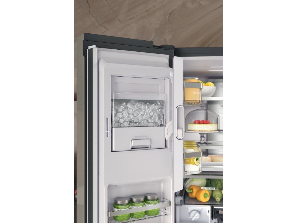 Led a čerstvá voda, kdykoliv potřebujete. Díky snadno použitelnému vnitřnímu výrobníku ledu můžete získat až 1,6 kg ledu denně, ať už drceného nebo kostkového.