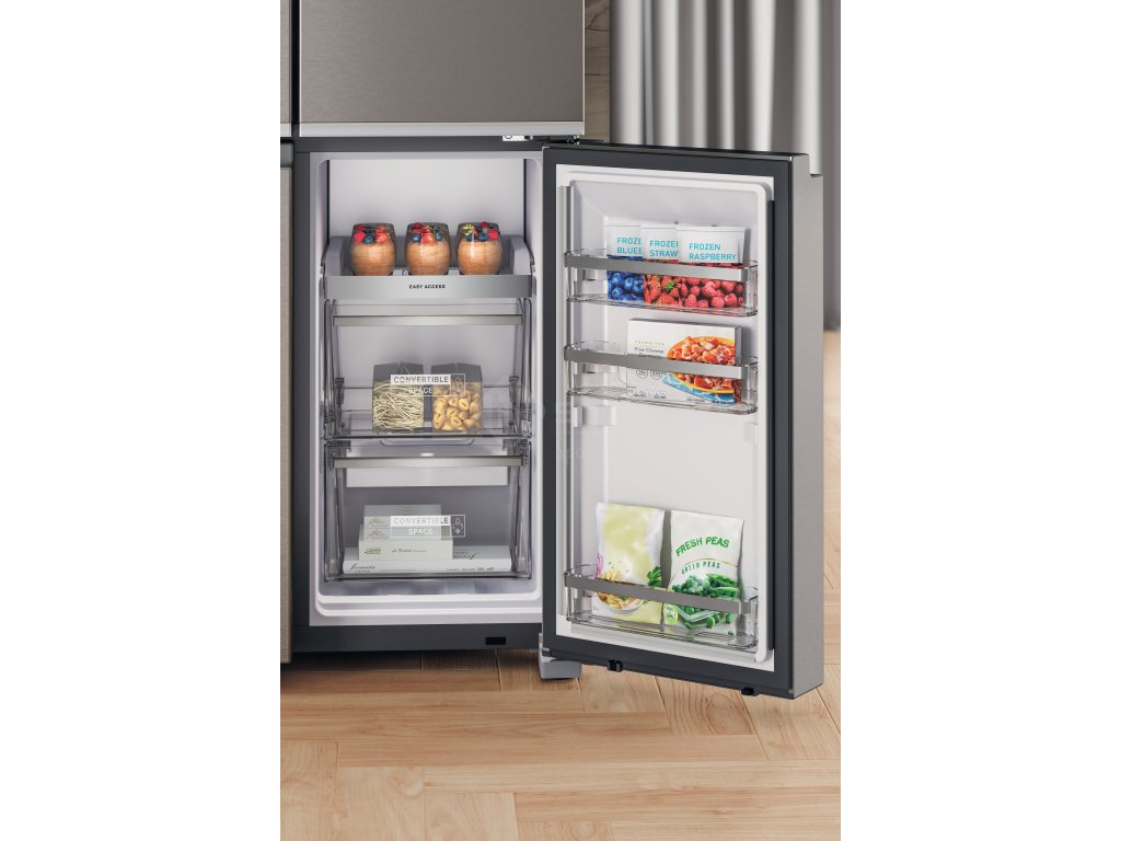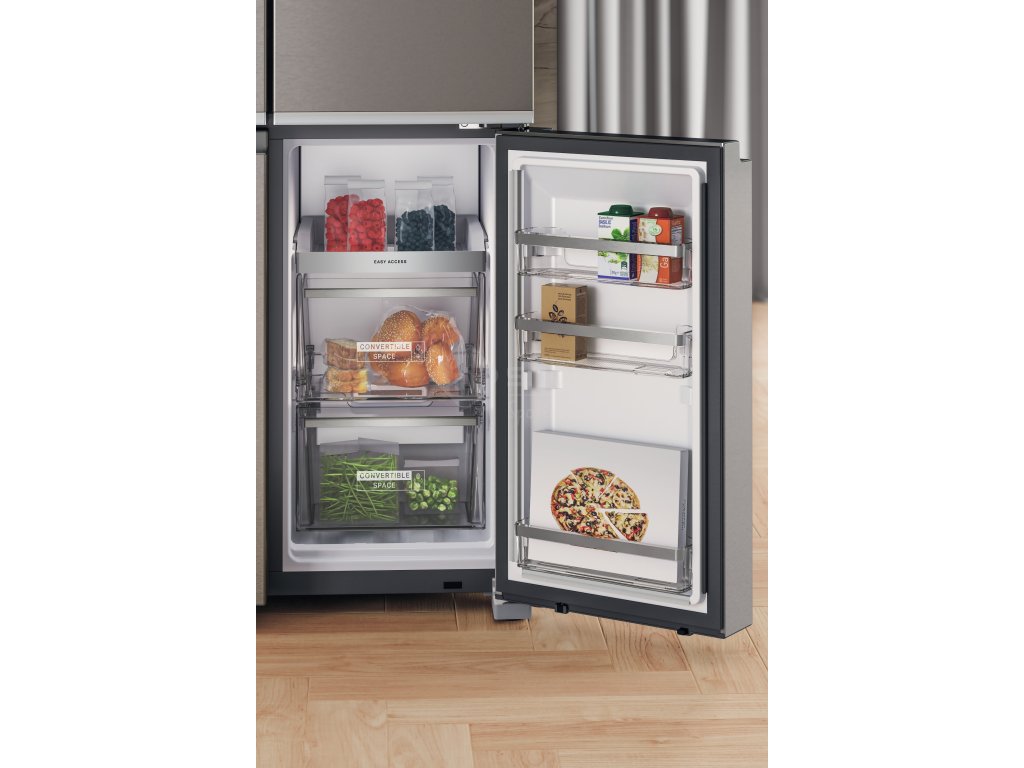 Prostorná přihrádka FlexiFreeze se přizpůsobí vašim potřebám a umožní vám zvolit správnou úroveň teploty pro to, co právě skladujete. Soft Freeze - 7 °C:vyhněte se procesu rozmrazování u zmrazených potravin, které sníte do týdne. Potraviny můžete vložit přímo z mrazničky do hrnce. Mild Freeze -12 °C: uchová zmrzlinu a dezerty vhodné k podávání. Deep Freeze -18 °C: uchová nutriční hodnotu potravin po delší dobu.